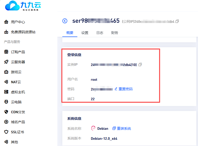 2.打开九九云服务器管理页面,获取ssh信息